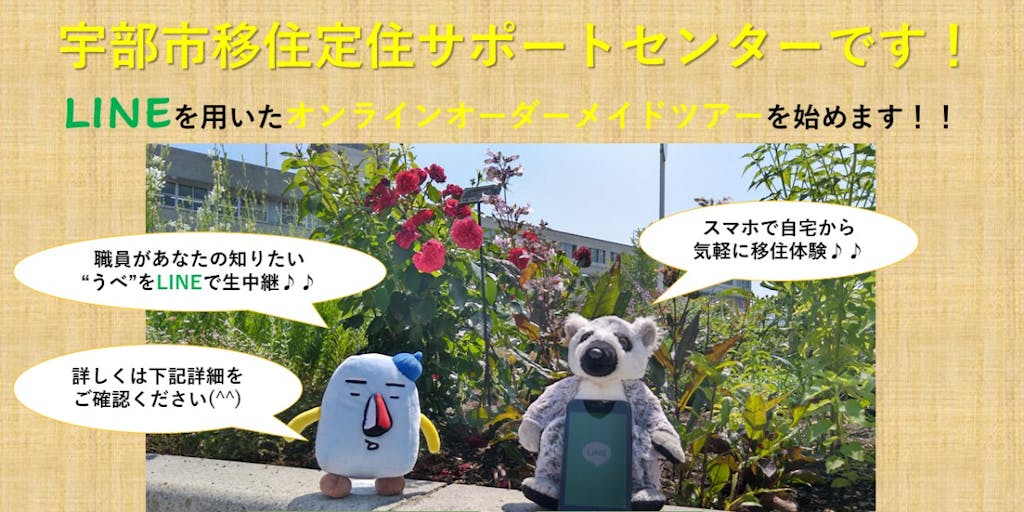 2021/12/31宇部市では、スマートフォンアプリ”LINE”を使って移住体験ができる「うべ移住体験オンラインツアー」を開始します。 自宅に居ながら、サポートセンター職員があなたに代わり、あなたの知りたい”うべ”をオーダーメイドでご案内します。 また、ツアーの前後にも、ご質問等があれば、いつでも対応いたします。 移住をお考えの全国の皆様、ぜひ宇部市の移住体験オンラインツアーをご検討ください♪