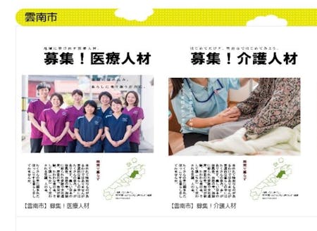 例えば、雲南市では、医療人材・介護人材の等の募集をしています。「地域に溶け込み、暮らしに寄り添う存在に。」なってくださる方を求めています。 市の中心部から出雲空港まで約20分、県庁所在地の松江市まで約40分、出雲大社の出雲市まで約30分の“ちょうどよい田舎”。中学卒業まで医療費無料や自然を活かした親子イベントなど、子育てしやすい環境があります。また、市内外のチャレンジャーを応援しており、若者や子育て世代の移住が増加しています。チャレンジと子育てにやさしい雲南市でほっこり暮らしてみませんか?
