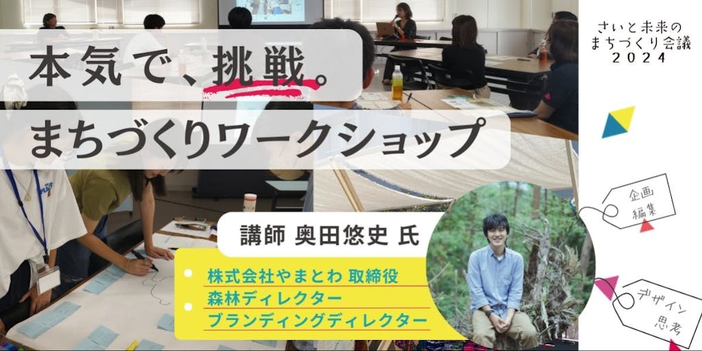 2024/06/18「本気で、挑戦、まちづくり。」 当会議は、西都のまちづくりに興味のある方や、まちを活性化させたい方が集まり、まちの未来について語り合いまちづくりについて学ぶ会議です。 3年目となる今年は、”デザイン思考を活かし「課題を素敵に解決」するディレクター”奥田悠史さんをメイン講師に迎え、まちづくり企画における大切な考え方や視点、具体的なつくりかたをワークショップ形式で学びながら、参加者の皆さんで「子育て世代の賑わいを創出する」事業を実際に企画立案します!その企画は、まちづくりサークル「SAITOBASE」と一緒に実現していきます。
