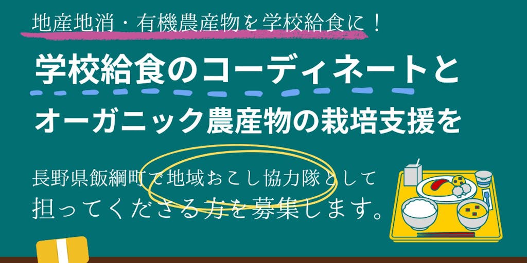 飯綱町は今年、オーガニック農業を推進するためオーガニックビレッジを宣言。まずは子どもたちの学校給食を、地場産で安全安心な野菜を使ったものにしていくべく、取り組みを始めました。そのため急がれるのは、出荷に協力してくださる生産者(農家さん)の育成と、供給体制の仕組みづくりです。生産者・調理場・直売所など、それぞれの役割と課題を調整しながら、オーガニック給食の安定供給を目指していただきたいと思っています。コミュニケーション力を発揮して、飯綱町のオーガニック農業を広めていくお手伝いをお願いいたします。一緒に飯綱町を盛り上げるべく、ぜひお力を貸してください。