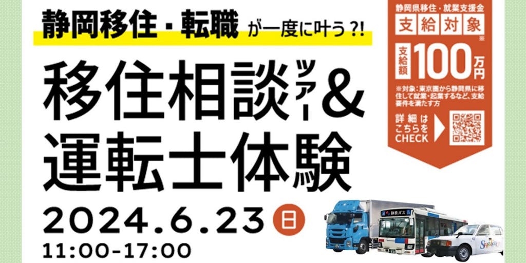 2024/06/20バス、タクシー、トラック事業に転職をお考えの方へ! 静岡でドライバーになりませんか? 「静岡で働き、暮らす自分」をイメージできる1日。 運転士体験と移住相談が一度にできる、特別な機会に、ぜひご参加ください!