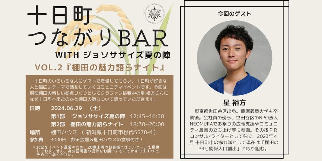 【十日町つながりBARとは?】 十日町市に住んでいらっしゃる様々な方にゲストで登壇して一つのテーマで話してもらうコミュニティイベント。テーマはその都度変わり、十日町に関わるモノ・コトなら幅広く開催します。十日町市のリアルな話を聞けるチャンスです。今回は第一部は棚田での農作業体験「ジョソササイズ夏の陣」第二部は『つながりBARvol.2 棚田の魅力語らナイト』です。ゲストは現在、棚田の関係人口創出する拠点づくりのためにクラファンに挑戦されている星裕方さんに登場していただき、棚田のある十日町の暮らしについて話していきます。 十日町に移住を検討している人や十日町にUIターンしてきた人、十日町大好きな人だれでも参加可能です!ぜひ、みなさんと十日町にまつわる話をできることを楽しみにしています!