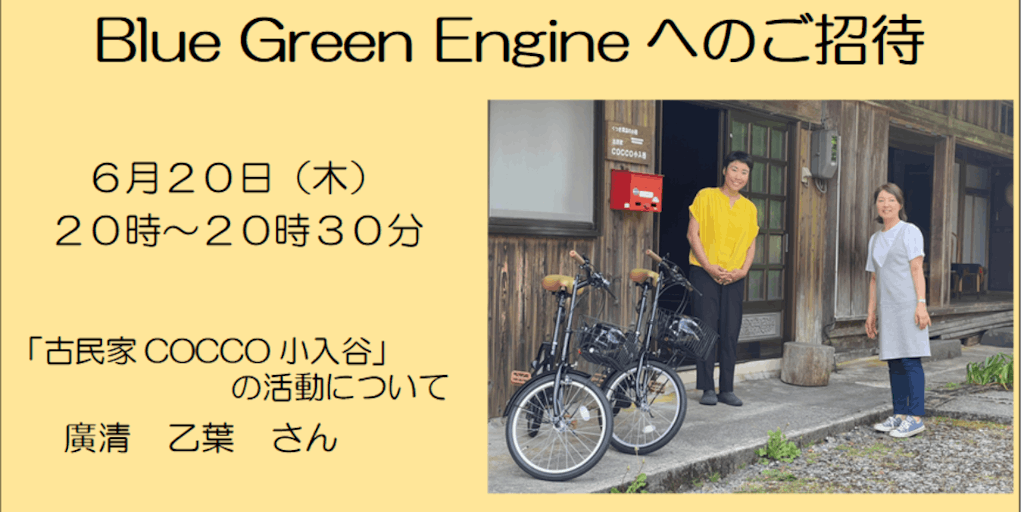 ・・・・・・・・・・・・・・・・・・・・・・・・・・・・・ Blue Green Engine 開催日時:令和6年6月20日(木)20:00~20:30 ※参加費・申込不要 テーマ:山の暮らしと林業について ゲスト:廣清 乙葉さん