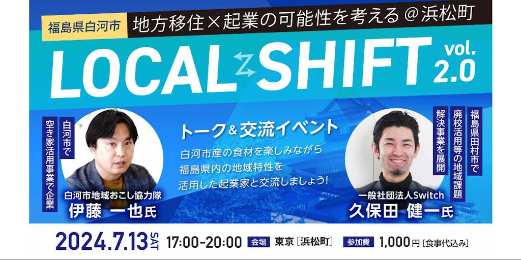 ・定員:20名 ・解散場所:FINEDAY浜松町 ・スケジュール: 16:30 受付開始 17:00 開会・白河市の紹介、事業紹介 17:15 自己紹介 17:30 乾杯&ゲストトーク開始 18:30 交流タイム 19:30 中締め・伝達事項 20:00 イベント終了