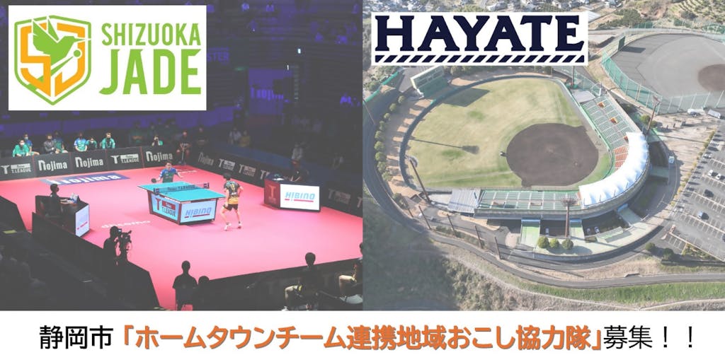 2024/07/16本市では、スポーツを通じて地域の一体感や市民の共感を呼び起こし、社会全体の協働・共創によるまちづくりを推進しています。その一環として、本市をホームタウンとする「くふうハヤテベンチャーズ静岡」(野球・NPBファームリーグ)、「静岡ジェード」(卓球・Tリーグ)をサポートし連携して地域交流や地域振興イベント等に取り組む「ホームタウンチーム連携地域おこし協力隊員」を募集します!