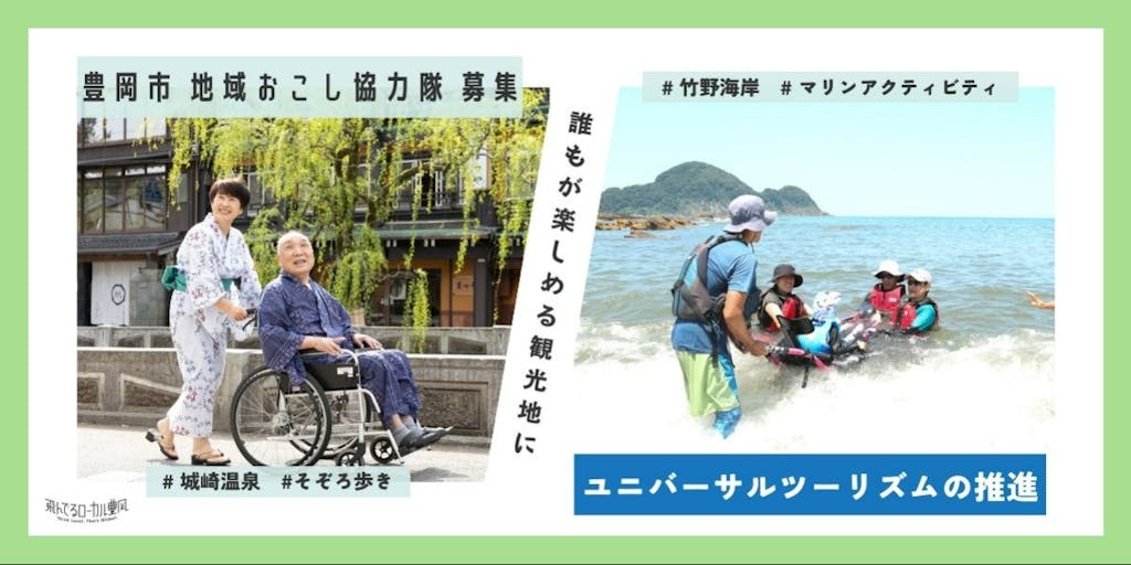 2024/07/26豊岡市は、兵庫県北部の日本海に面しており、開湯1300年以上の歴史がある城崎温泉をはじめ、日本の渚100選に選ばれた竹野海岸、ウィンタースポーツやアウトドアなどが楽しめる神鍋高原などの多くの観光地やアクティビティーが楽しめる場所があります。 近年、高齢化が進むにつれ、これまで旅行やアクティビティーを楽しんできた方たちも高齢となって介助が必要となると、旅行やアクティビティーを諦めてしまうケースが増えていくことが予想されます。 高齢になっても、介助が必要になっても、豊岡のまちを気軽に楽しんで欲しい、楽しい充実した時間を過ごしてほしいという思いから、城崎温泉を拠点にユニバーサルツーリズムを推進し、市内外に広げていきたいと思っています。 ユニバーサルツーリズムの推進のための新たなサービスや体制づくりやプロモーション、連携団体と協力した関連イベント企画・運営を行う地域おこし協力隊を募集します!