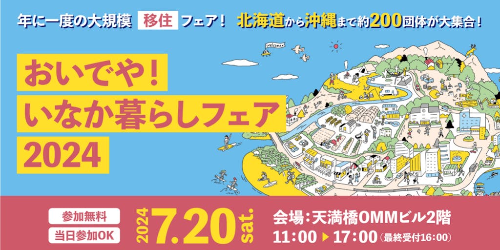 2024/07/20西日本最大級の移住イベント「おいでや!いなか暮らしフェア」が、7月20日(土)に大阪で開催されます。 少しでも興味がある方、「興味がある」ボタンを押して、最後まで読んでみてください!