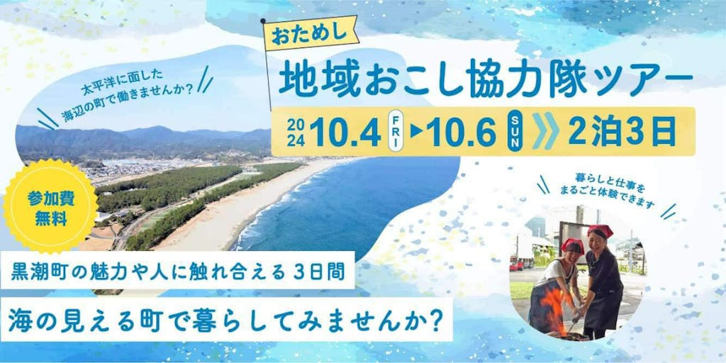 <<開催概要>> 開催日時:10/4(金)〜10/6(日) の2泊3日 開催場所:高知県黒潮町内 定員:5名 対象:黒潮町への移住や地域おこし協力隊の応募を検討している方 参加費・宿泊費:無料 ※黒潮町までの往復交通費・滞在中の食費(全体を通して11,000円程度)は個人負担となります。 ※集合場所等については、参加が確定した方に別途メールでご連絡いたします。