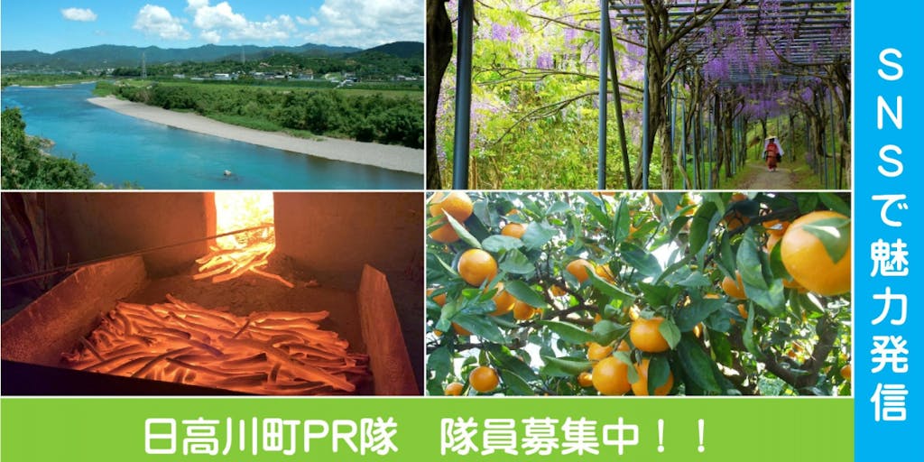 日高川町では町の魅力を外部に発信していただける『日高川町PR隊』を募集しています!! 本町は和歌山県最古の寺院で歌舞伎の舞台としても有名な「道成寺」、日本一の長さの「藤棚ロード」や「キャンプ場」などの自然を活かした様々な観光地が人気となっています。 また特産物として、日本一の生産量の「紀州備長炭」が有名で、温暖な気候を活かした「温州みかん」などの柑橘類や様々な農産物の栽培も盛んです。