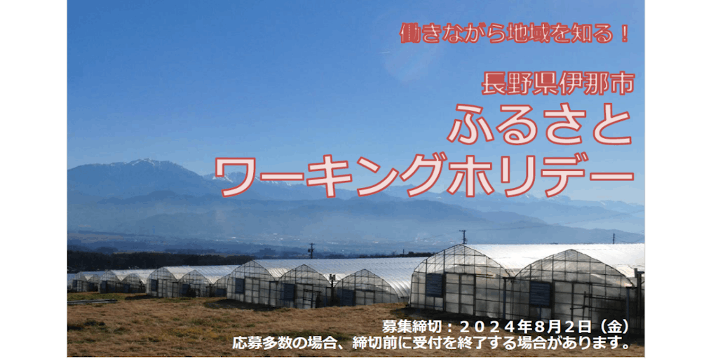 人生の大きな選択「移住」。実際にその地を知らずに移住先を決めることは難しいけど、今の生活を中断してまで探すことはできない、と一歩を踏み出せずにいるあなた。 長野県伊那市で「仕事」と「暮らし」を体験できる、ふるさとワーキングホリデーに参加してみませんか! 仕事をしながら、伊那市にいる間に、多くの人と出会っていただいたり、伊那の風土や魅力ある景観を楽しんでいただけるよう、お手伝いします。