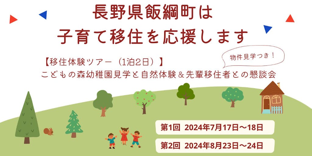 【飯綱町移住体験ツアー こどもの森幼稚園見学と自然体験+物件めぐり】 ●日程 第1回 日程:2024年7月17日(水)~18日(木) 第2回 日程:2024年8月23日(金)~24日(土)