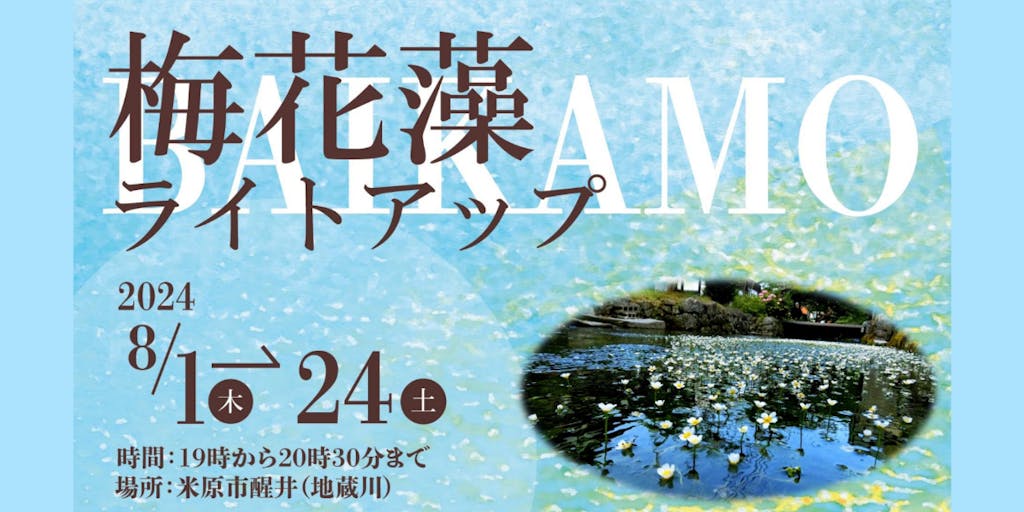 2024/08/05暑い日が続きますね。そんな時は米原市醒井(さめがい)にある人気の観光スポット、地蔵川に咲く梅花藻(バイカモ)観賞はいかがでしょうか。 米原市醒井は中山道61番目の宿場町。そこに流れる地蔵川は環境省が平成の名水百選に選定した居醒の清水(いさめのしみず)から湧き出ており、大変珍しい水中花「梅花藻(ばいかも)」で有名です。水温は年間を通じて14度ほどと安定しており、貴重な淡水魚である「ハリヨ」も生息しています。 また、8月1日木曜日から8月24日土曜日にかけてはライトアップを実施していますので、ぜひ夕涼みにお越しください。
