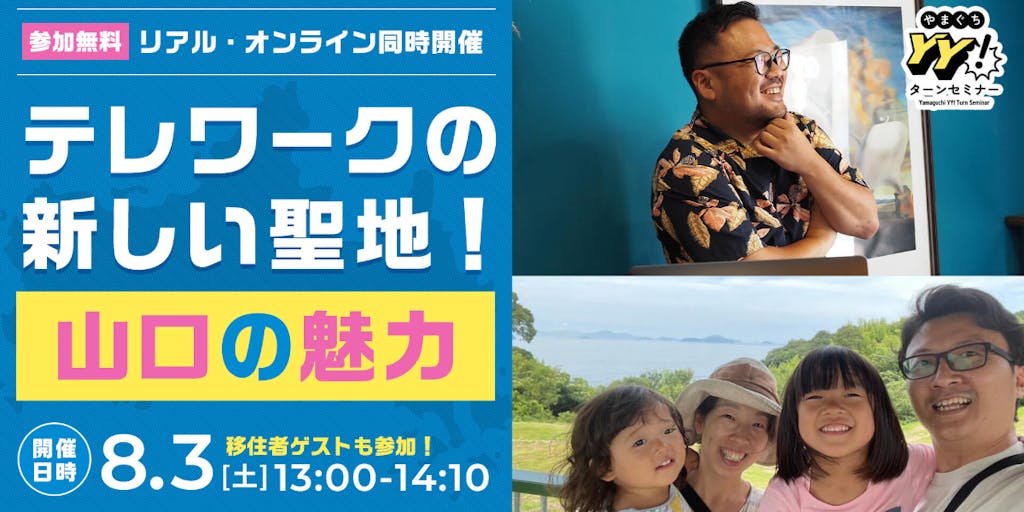 関東から移住し、山口県でテレワークを実践する2人の移住者ゲストをお呼びして、移住前後で変化した暮らしや仕事、趣味についてのことなどの実体験を元に山口県ならではのテレワークの魅力をリアルにお伝えします。