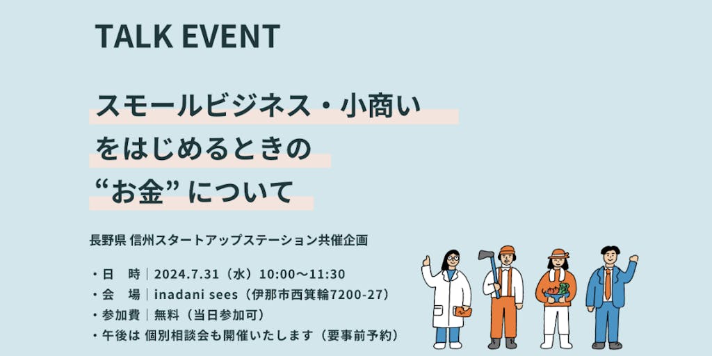 2024/10/20「企てをカタチに」をミッションに掲げる伊那市の農と森のインキュベーション施設 inadani seesが、長野県の創業相談窓口「信州スタートアップステーション」とコラボして、起業家と金融機関のゲストをお招きし、特にスモールビジネスや小商いをはじめるときの”お金”について、トークイベントを開催します。