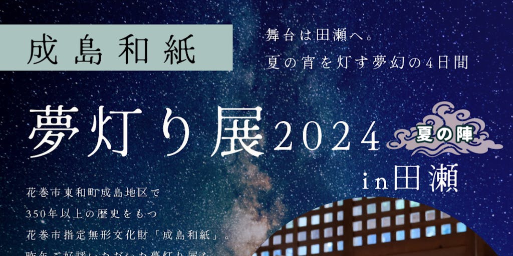 花巻市東和町成島地区で350年以上の歴史をもつ花巻市指定無形文化財「成島和紙」。 昨年ご好評いただいた夢灯り展を今年の夏、東和町田瀬地区にて開催します。 田瀬湖を望む豊かな自然と優しい和紙灯りが織りなす幻想的な景色を是非お楽しみください。