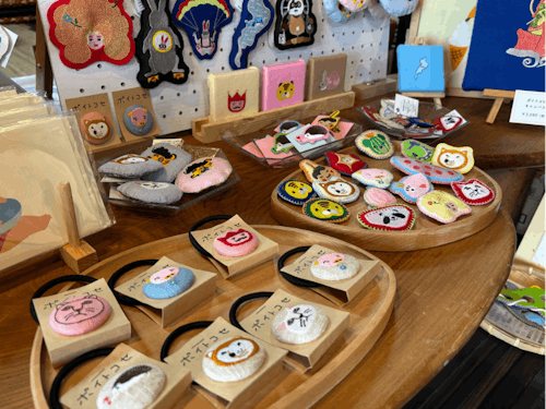▼刺繍屋ポイトコセ 「ののすておりがみ」の他にもオリジナルアイテムを何か一緒に販売できないかと考え、生まれた「刺繍屋ポイトコセ」。「ポイトコセ」とは「ピョンと跳び越えろ」を意味する言葉で、愛知川に伝わる民話から名付けました。モノクロの折り紙とは対照的に、カラフルなオリジナルデザインのミシン刺繍アイテムを販売しています。店頭では主にバッグ、ポーチ、ワッペン、キーホルダーなどを取り揃えています。2023年からは、インド綿を使った商品展開に力を入れていますが、これも愛荘町内で知り合ったインド出身の方が、お店とインドの会社を繋いでくださったことがきっかけです。 今後も「ののすておりがみ屋」を含め、さまざまな人と一緒に、ユニークな商品展開を行っていきたいです。