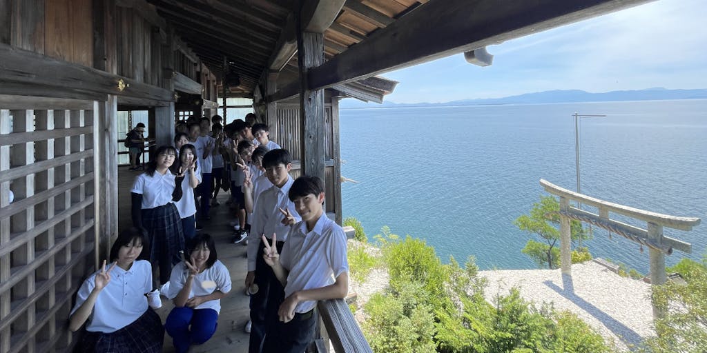 とても良く晴れた、朝から太陽がまぶしい日。 長浜港に市内12の中学校から生徒さん達22人が少し緊張した面持ちで集まりました。 事前にオンラインで顔合わせをしていたとはいえ、実際に会うのは今回が初めて。 今回の企画の担当者から説明を受け4班に分かれて、さあ乗船! 竹生島に行くのは初めてという生徒さんも半数ほどおられ、船の出航にテンションも上がってきたのか、船の上から見る長浜の景色が新鮮だったのか、それともお互いの中学校生活の話が面白いのか、デッキの上で班ごとに自然と会話が盛り上がっていました。