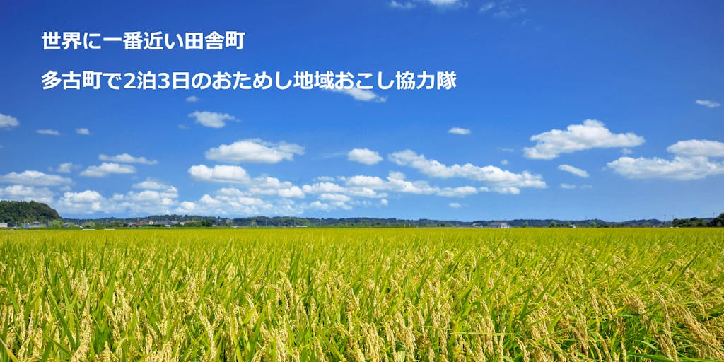 多古町は成田国際空港の東側に位置しています。 「多古米」というブランド米があるとおり主産業は農業の町です。 多古米以外にも「やまと芋」や「さつまいも」の産地となっています。 また、東京駅から高速バスで110分と都心に通いやすい環境となっており、 町内にはテレワークができる施設もあるので、自然に囲まれ仕事をしながら、都心へもすぐにアクセスできる“ちょうどよい距離感”の町です。 そんな多古町では、2泊3日の「おためし地域おこし協力隊」を募集することになりました。 多古町地域おこし協力隊として活躍する意思のある方や、多古町に定住し地域振興に力を発揮する意思のある方など地域おこし協力隊の活動をぜひ体験してみてはいかがでしょうか?