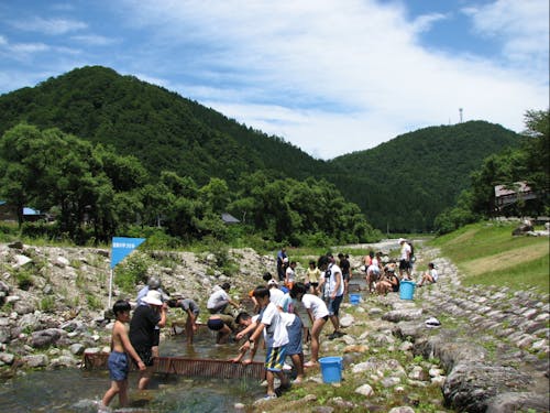 ◆魅力その1:利賀の清流で育った岩魚の掴み取りができる! 岩魚は源流域の水温が低く、澄んだ川に生息していると言われています。利賀は標高が 400~800mに位置しており、水も綺麗なため岩魚の生育に最適。今回は神通川の支流「百 瀬川」の源流域で育ったそんな岩魚の手掴み体験を準備しています