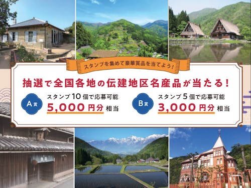 《賞品》 A賞:スタンプ10個で応募可能 全国各地の伝建地区所在市町村の名産品 5,000円分相当