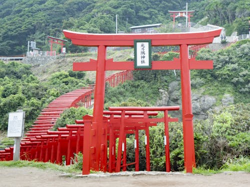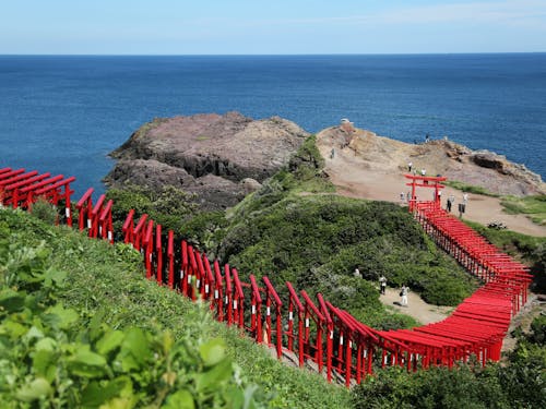 また、元乃隅神社の最大の特徴は、約10年をかけて奉納された、123基の赤い鳥居です。この鳥居は、海へと向かって緩やかなカーブを描きながら並び、その景色はまるで異世界に迷い込んだかのような幻想的な美しさ。鳥居のトンネルをくぐり抜けると、その先に広がるのは、日本海の雄大なパノラマビューです。晴れた日には、青い海と空、そして赤い鳥居の鮮やかなコントラストが参拝客を魅了します。