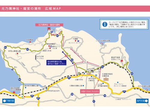 車でのアクセスの場合、中国自動車道の美祢ICから約60分のドライブで、神社に到着します。神社徒歩圏内に公共交通機関はございませんので、車がない場合は、JR長門古市駅またはJR人丸駅よりタクシーを利用されることをおすすめします。(片道3,000円前後) また、道の駅センザキッチンを発着地とした元乃隅神社もめぐる「ながと周遊観光タクシー」も運行されているので、こちらも利用可能です。(1日1便・要予約)