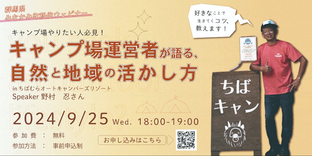 みなかみ町での暮らしやチャレンジを伝える、みなかみ町移住ウェビナー! 今回はアウトドアの町みなかみでも多くあり、最近までブームになっていた「キャンプ場」にフォーカスして、移住者であり現在キャンプ場の運営を行っている野村忍さんをお呼びして、お話をお聞きします!