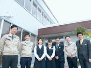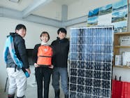ソーラーパネルの前の女性社員のお二人は、豊岡市が開催した就活イベントで入社されているんです。