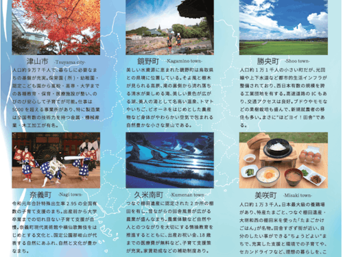 【久米南町 くめなんちょう】 つなぐ棚田遺産に認定された2か所の棚田を有し、昔ながらの田舎風景が広がる農業が盛んなまち。農業体験など自然や人とのつながりを大切にする情操教育を推進するとともに、出産お祝い金、18歳までの医療費が無料など、子育て支援策が充実。家賃助成などの補助制度あり。