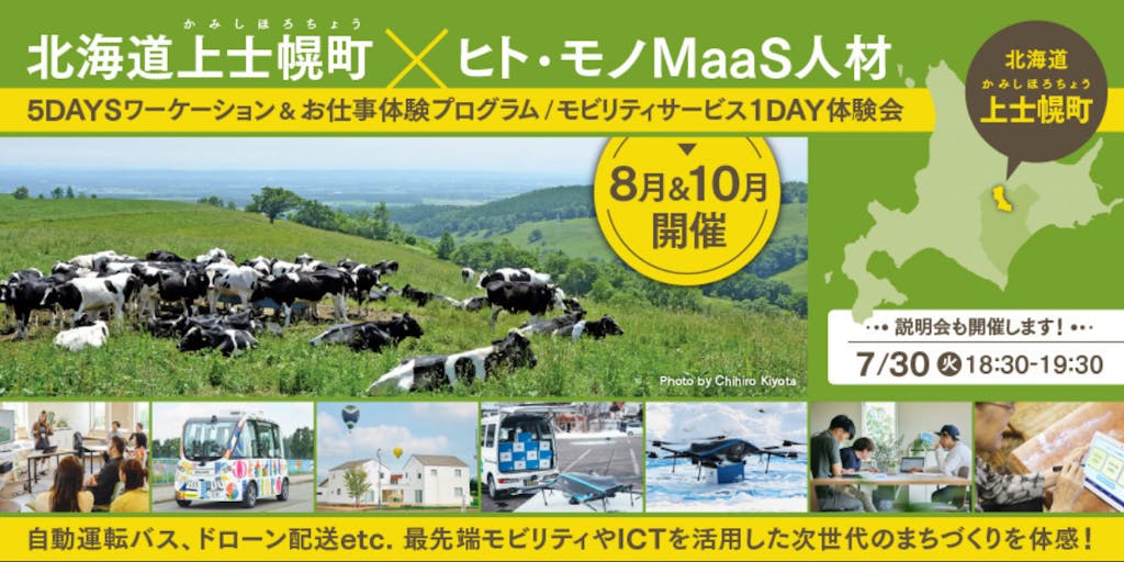 地域おこし協力隊として応募する前に、上士幌町でのお仕事や暮らしを体験したいというあなたに・・・ 5日間上士幌町に滞在しながら、町のモビリティーサービスに関わるお仕事体験や現役地域おこし協力隊との交流等を通じて、暮らしをイメージいただく「上士幌町×ヒト・モノMaaS人材 5DAYSワーケーション&お仕事体験プログラム」を開催します!