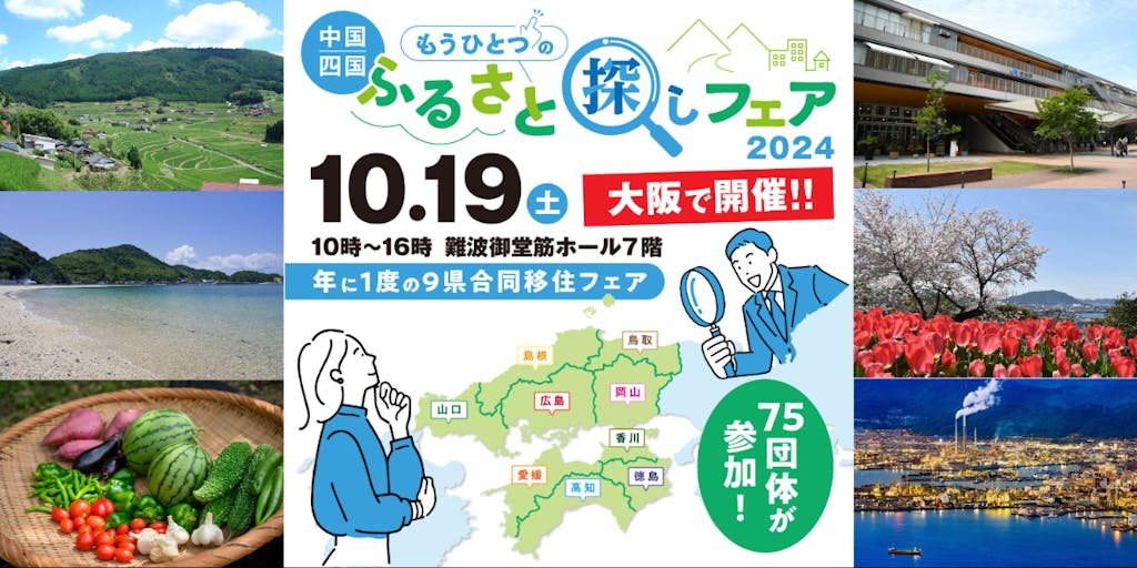 2024/10/17年に一度、中国・四国地方の9県が合同で開催する移住フェア。 移住で気になること、なんでも相談できます!
