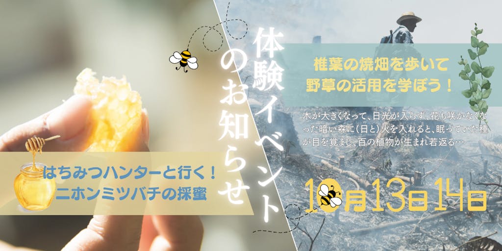 10月13日(日) はちみつハンターと行く!ニホンミツバチの採蜜 10月14日(月・祝) 椎葉の焼畑を歩いて野草の活用を学ぼう!