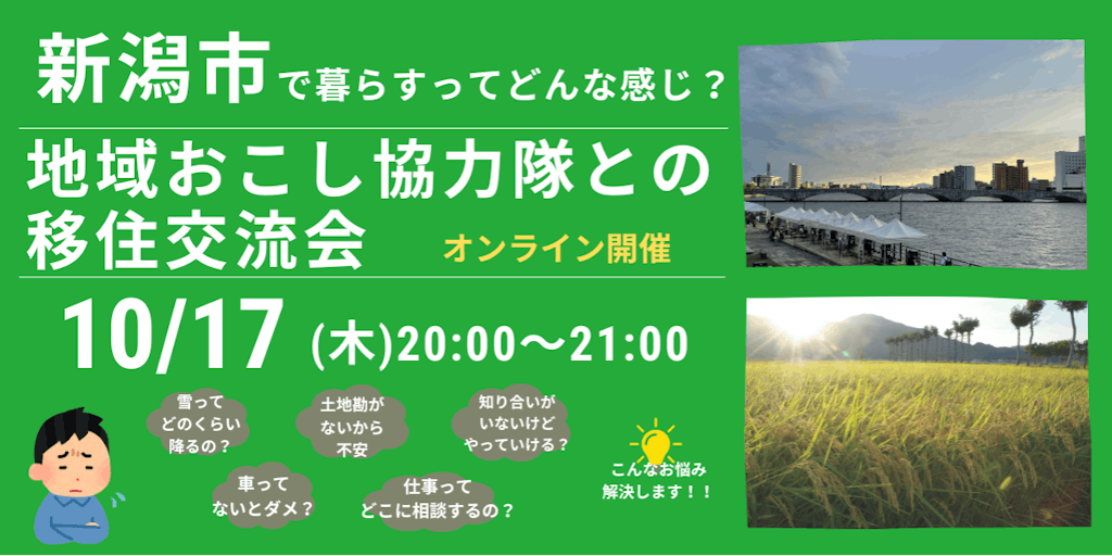 2024/10/06いつかは新潟で暮らしたい方、新潟移住を検討中の方向けに、10月17日(木)の夜にオンラインイベントを開催します。 新潟市での実際の生活をお伝えするのはもちろん、地域おこし協力隊と繋がる貴重な機会です!