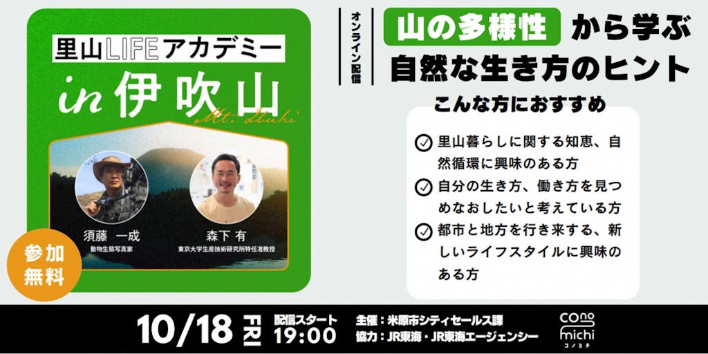 2024/10/16様々な地域で活躍する専門家によるトーク&ディスカッションを通じて、「伊吹山ならでは」の魅力を感じていただきながら、「自然な生き方」のヒントを学び、自分の視野を広げていきます。