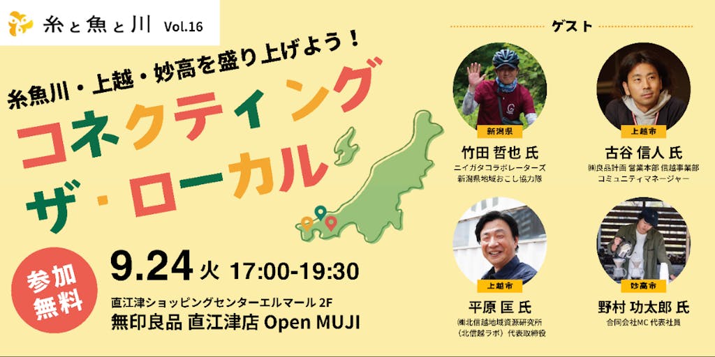 2024/09/27コネクティング the ローカル 〜糸魚川・上越・妙高を盛り上げよう!〜 本イベントは、上越三市(糸魚川市、上越市、妙高市)の連携に向けたキックオフミーティング!上越地域の活性化を目指し、各市の職員や事業者、一般の方々を対象に、地域連携の可能性を探る場を提供します。第一部では、各市で活動されているゲストがスピーカーとして登壇!その取り組みや今後の展望についてお話いただきます。第二部は、参加者していただいたみなさまと一緒に地域連携の可能性を自由にディスカッションしましょう!このイベントはどなたでも無料でご参加いただけます!