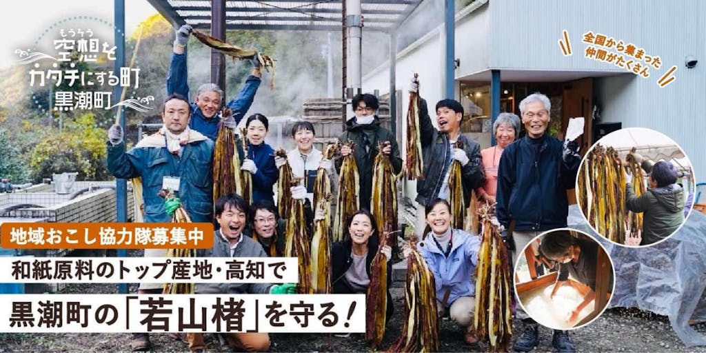 ・定員:3名 ・解散場所:高知県黒潮町 ・スケジュール: ■インターンの活動内容 ・オリエンテーション(初日) ・町内めぐり ・若山楮の作業体験(楮刈り取り、楮の蒸し剥ぎなど) ・地域おこし協力隊との交流会 ・インターン報告会(最終日)