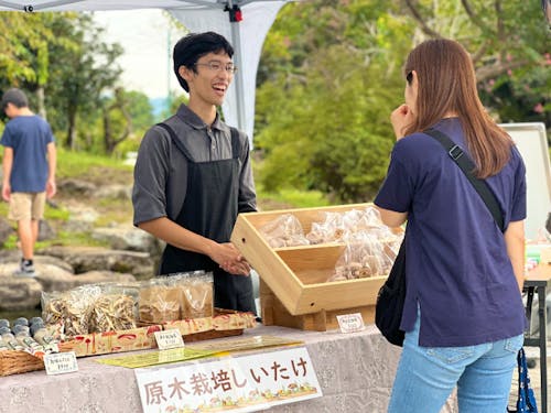 大多摩霊園の敷地内に、原木椎茸を育てる内沼きのこ園さんや、地元のお饅頭屋さん、地元成木の川口農園さんの直売店、青梅の地ビールを提供している酒屋さんなど、合計6店舗のブースが出店。さらに、お墓参りに訪れた家族連れなどがゆったりと時間を過ごしていただけるよう、テラスにテーブル席を作りました。お墓参りの帰りにマルシェに立ち寄って青梅の野菜を買って行く人や、飲み物やお菓子を買ってゆっくりとテラスで話を楽しんでいくご家族も。