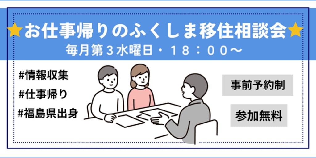 2024/10/11福島県は、毎月第3水曜日に「お仕事帰りのふくしま移住相談会」を開催しています。 これから移住を考える方、昼間や土日は忙しくて時間がとれない方、お仕事帰りの方など、お気軽にご相談ください。