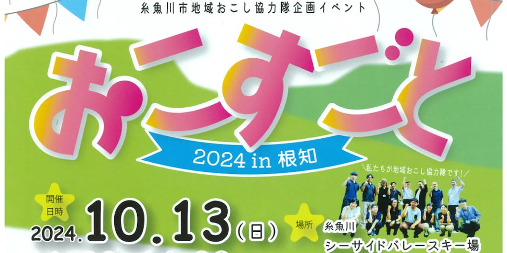 日程 2024年10月13日(日) 時間 11時~14時 費用 入場無料 ※一部飲食で有料となるブースがあります。 場所 糸魚川シーサイドバレースキー場 新潟県糸魚川市大字山口151-1