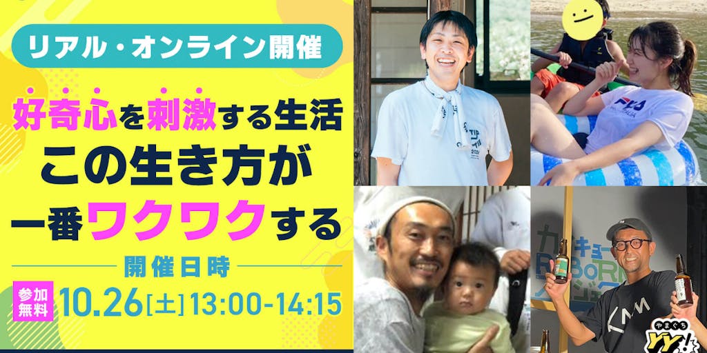 【開催日時】令和6年10月26日(土) 13:00-14:15〈トークセッション、参加市町紹介〉 【開催場所】リアル:fabbitGGアクロス福岡<セミナールームA> (福岡市中央区天神1丁目1−1 アクロス福岡 1階) オンライン:申込いただいたのちにURLをご送付 【スケジュール】 13:00〜 開会 13:05〜 トークセッション 14:00〜 参加市町の紹介(下関市、周防大島町、山陽小野田市) 14:10〜 閉会 ※14:20〜 ゲスト、参加市町との意見交換を希望される方は同会場にて交流会を実施。 【参加申込】 参加を希望される方は、事前申込が必要です(参加無料) 興味ある!をクリックして、こちらからお申込ください。 https://ymg-uji.jp/lp/yyturn2024_event10_lp/
