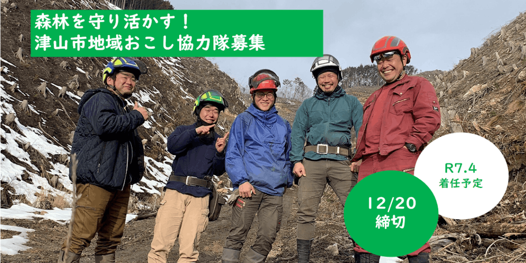 <こんな方を募集!> ・林業に興味があり、津山市のために活動をしたいという意欲のある方 ・体を動かす仕事が好きな方 ・地域住民や移住希望者と柔軟なコミュニケーションをとれる方 ・基本的なPC操作ができる方 ・SNS等を活用して、協力隊員の活動や地域・林業の魅力について、 全国に情報発信ができる方