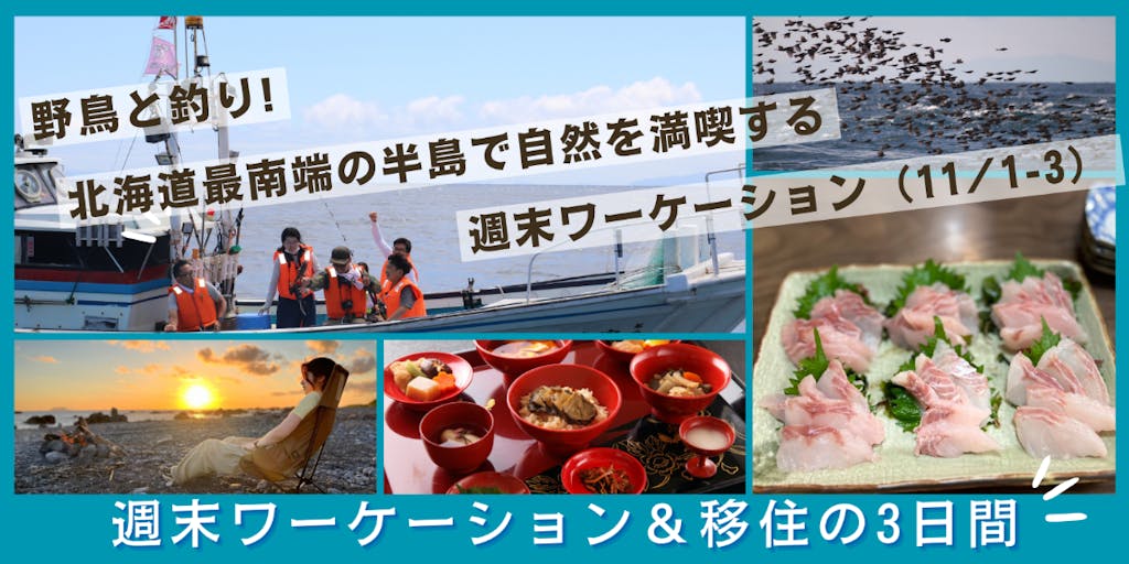 ・定員:10名 ・最小催行人数:2名 ・解散場所:矢野旅館/最終日は自由行動・自由解散 ・スケジュール: 1日目:蝦夷を知る! ・松前町ご到着(~16時は自由に。コワーキング施設を活用したり、散策したり) ▶体験①:観光ガイドによる地域歴史案内(16時~) ▶体験②:矢野旅館で藩主料理と温泉を堪能 2日目:ガッツリ体験! ▶体験③:白神岬、この季節だけの渡り鳥ウォッチング! ・宿で、地域の昆布出汁のきいた朝食 ▶体験④:地元船長が案内する!レジャーフィッシング! ・午後はフリー:地元オススメ、松前の自然満喫体験!ご自由にお過ごしください。 (地元オススメプラン) 1.リエネウィンドファーム松前で大迫力の大型風車を見学 2.(風の強さを感じながら)パークゴルフ 利用料:420円/人、用具:210円/人(中学生以下は全て無料) 3.折戸浜:シーグラス拾いや夕陽などゆっくり楽しむ 4.陸でそのまま釣り三昧。 ▶体験⑤:居酒屋「喜楽」に魚を持ち込んで、おいしいを堪能(持ち込み料のみ料金に含まれています。その他の飲食はご自身で別途お支払い) ・矢野旅館泊 3日目:思い思いの過ごし方を ・フリーです。 ・道の駅でお土産を買ってもよし、コワーキングスペースで仕事をしてもよし。