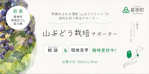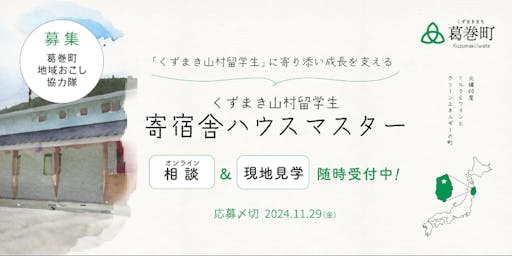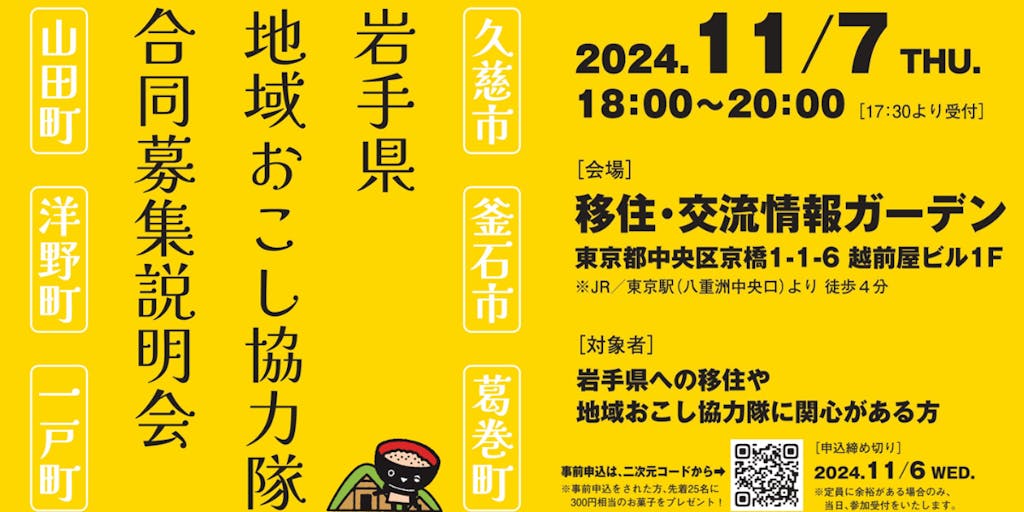 2024/11/07この度、葛巻町では、東京の八重洲口にある「移住・交流情報ガーデン」において、『岩手県地域おこし協力隊合同募集説明会』に参加いたします。 当町からは、葛巻町地域おこし協力隊のOBとOGが参加いたしますので、葛巻町地域おこし協力隊を検討されている方や地域おこし協力隊に興味・関心のある方は、ぜひご検討ください!