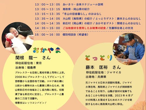 当日タイムテーブル 13:00~ あいさつ・全体スケジュール説明 13:05~ 鳥取県・岡山県の紹介 13:15~ 「冬山の田舎暮らし」のおはなし 13:35~ 大山町(鳥取県)の紹介/とっとりゲスト藤本さんのおはなし 14:05~ 新庄村(岡山県)の紹介/おかやまゲスト関根さんのおはなし 14:35~ ご当地食材を使用したお雑煮の試食/先輩移住者との交流会