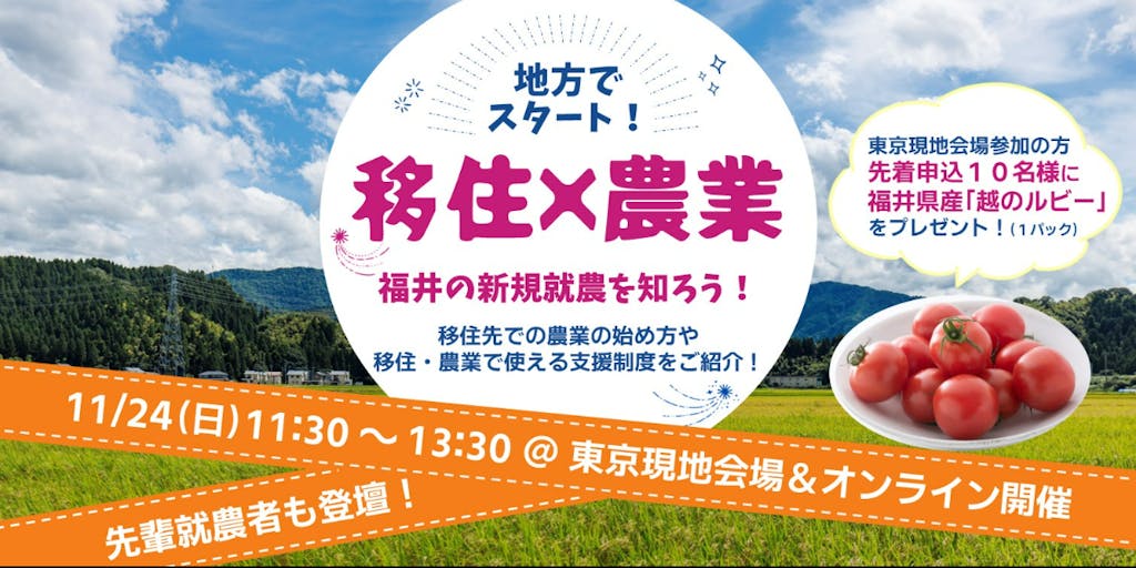 そしてなんと!今回は、東京会場にご参加いただける方先着申し込み10名様に、 福井県内で生産されているミディトマト「越のルビー」(1パック)をプレゼントします! 通常の大玉トマトに比べて甘みが強く、トマトが苦手な方も食べやすい美味しいトマトです🍅 首都圏近郊の方はぜひ現地にお越しください!!