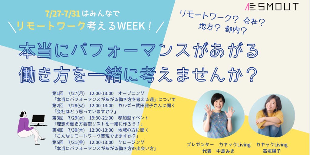 7/27(月)12:00-12:30(30分)LIVE配信 第1回:[オープニング]「本当にパフォーマンスがあがる働き方を考える週」について (中島みき、高垣陽子 株式会社カヤックLiving)
