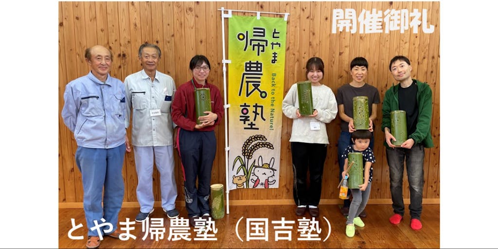 《開催プログラム》 ・移住就農の若手酪農家を訪ねる(餌やり、搾乳等) ・移住者と地域の交流会 ・里山竹林保護を学ぶ ・りんご狩り ・里芋収穫体験 ・国吉の孟宗竹を使用したランプシェード作り