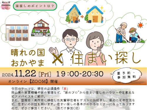 2024/11/09移住において必須条件となる「家」!! 今回は「住まい探し」と題して、ともに大阪から、全く縁のなかった岡山県へのIターンをした塩田さんと岸本さんのお二人をゲストにお招きし、当時の家探しや、現在の生活、今後の計画などをお伺いします。 また、「家」のプロ!!岡山県不動産サポートセンターの住田さんにも登場していただき、住まい探しのハウツーや注意点などのアドバイスをご紹介いただきます。 「住まい探し」の基本がわかるセミナーとなっておりますので、ぜひご参加ください。 オンライン配信なので、耳だけ参加もOKです!(要事前申込)