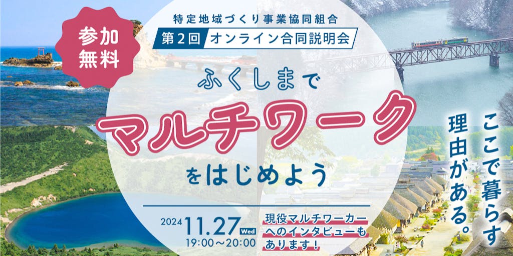 ■開催日時:令和6年11月27日(水)19時00分~20時00分 ■参加方法:オンライン(Zoom) ■対象者:福島県内への移住やUターンを検討している方、マルチワークや田舎暮らしに興味がある方 等(福島県在住者も可) ■プログラム: (1)特定地域づくり事業協同組合制度について (2)各組合プレゼンテーション (3)先輩マルチワーカーの移住体験トーク (4)質疑応答
