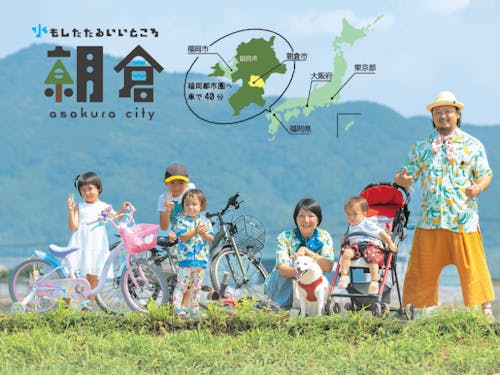 「水もしたたるいいところ」 福岡県のほぼ中央部に位置する朝倉市は、 暮らしに潤いを与える、水の恵みあふれるところ。市の北東西を山々に囲まれ、南には九州一の大河・筑後川が流れています。 自然はもちろん、新鮮な食材やレジャー、人の温かさに近い、豊かな暮らしができます。それでいて、福岡都市圏へのアクセスも良く、約40分圏内です。 移住・定住のための制度も充実していて、お試し居住が無料で利用できます。